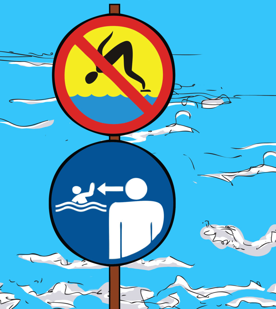 1) Znak zakazu ???? – skakanie do wody zabronione (często mylony z zakazem skoków TYLKO na główkę)